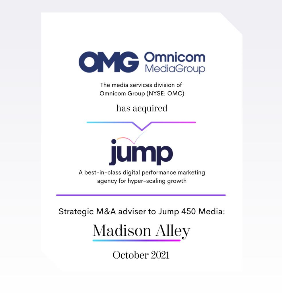 Andreas Roell, Managing Director of Madison Alley, noted, “Working with the talented Jump team was a true honor. We are delighted to see Jump 450 align itself with Omnicom Media Group to take their best-in-class performance marketing services to new heights. This acquisition will create an extraordinary performance agency powerhouse that will have an exponential impact for its clients and results. Congratulations to Omnicom Media Group and Jump 450!”